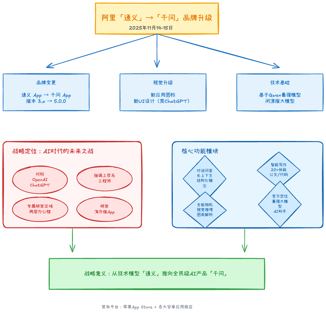 2025年11月14日至15日,阿里巴巴旗下人工智能应用“通义”App在苹果App Store和各大安卓应用商店完成品牌升级,正式更名为“千问”App,版本号从原有的3.59.1或3.60.0直接跃升至5.0.0。此次更名同步更新了应用图标及内部UI设计,其界面布局与ChatGPT相似。