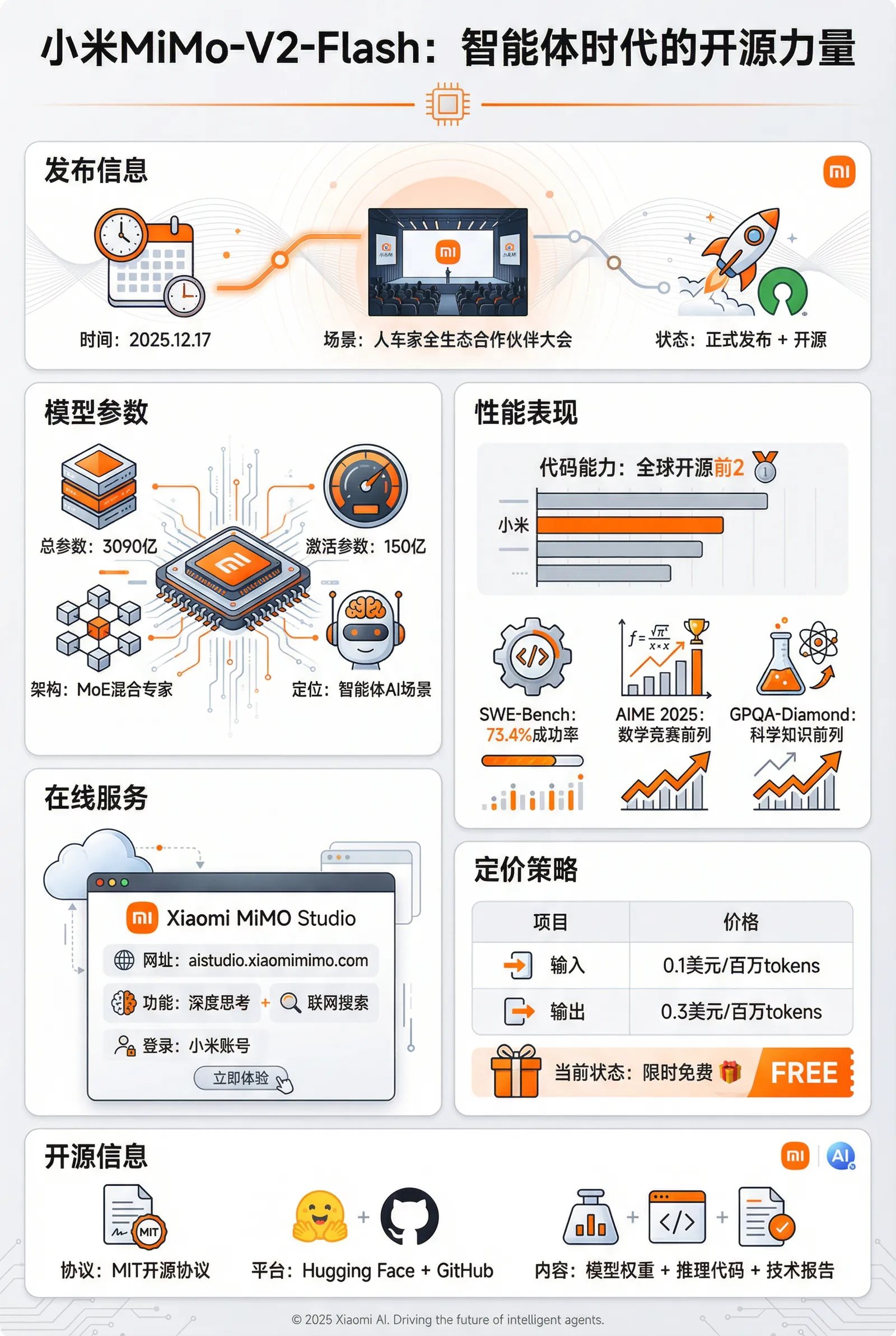 2025年12月17日,小米公司在“人车家全生态”合作伙伴大会上正式发布并开源了MoE大模型MiMo-V2-Flash。该模型总参数为3090亿,激活参数为150亿,采用混合专家架构,专为智能体AI场景设计,侧重于提升推理效率。模型在多项基准测试中表现突出,代码能力进入全球开源模型前二,在SWE-Bench Verified测试中成功率为73.4%,并在AIME 2025数学竞赛和GPQA-Diamond科学知识测试中位列开源模型前列。