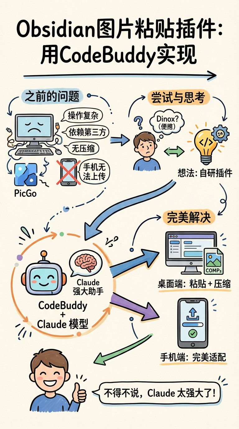 之前的 Obsidian 插件虽然能通过 Picgo 粘贴图片,但操作复杂,需要依赖第三方软件,而且上传的图片没有经过压缩。在手机上更是无法上传。后来尝试用 Dinox 这款软件在移动端上传,发现同样不方便。于是考虑,能否自己用 CodeBuddy 开发一个插件,让它既能粘贴和压缩图片,又能适配手机端。最终完美解决了问题,不得不说,Claude 模型太强大了。