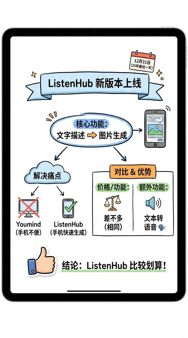 ListenHub 在 12 月 31 日,也就是 25 年的最后一天,上线了新版本,可以通过文字描述生成图片,非常方便,解决了 youmind不能在手机上快速生成图的痛点。相同的价格,功能差不多,并且还能进行文本转语音,ListenHub 还是比较划算的。