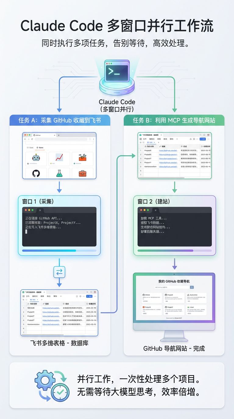 使用 Claude Code 打开多个窗口,就能同时执行多项任务。例如,我可以一边将 GitHub 收藏的项目采集到飞书多维表格,另一边利用多维表格的 MCP 生成一个 GitHub 收藏项目导航网站。两个窗口并行工作:一个负责采集,一个负责建站。这非常方便,它解决了大模型思考时需要等待的问题,让我能一次性处理多个项目。