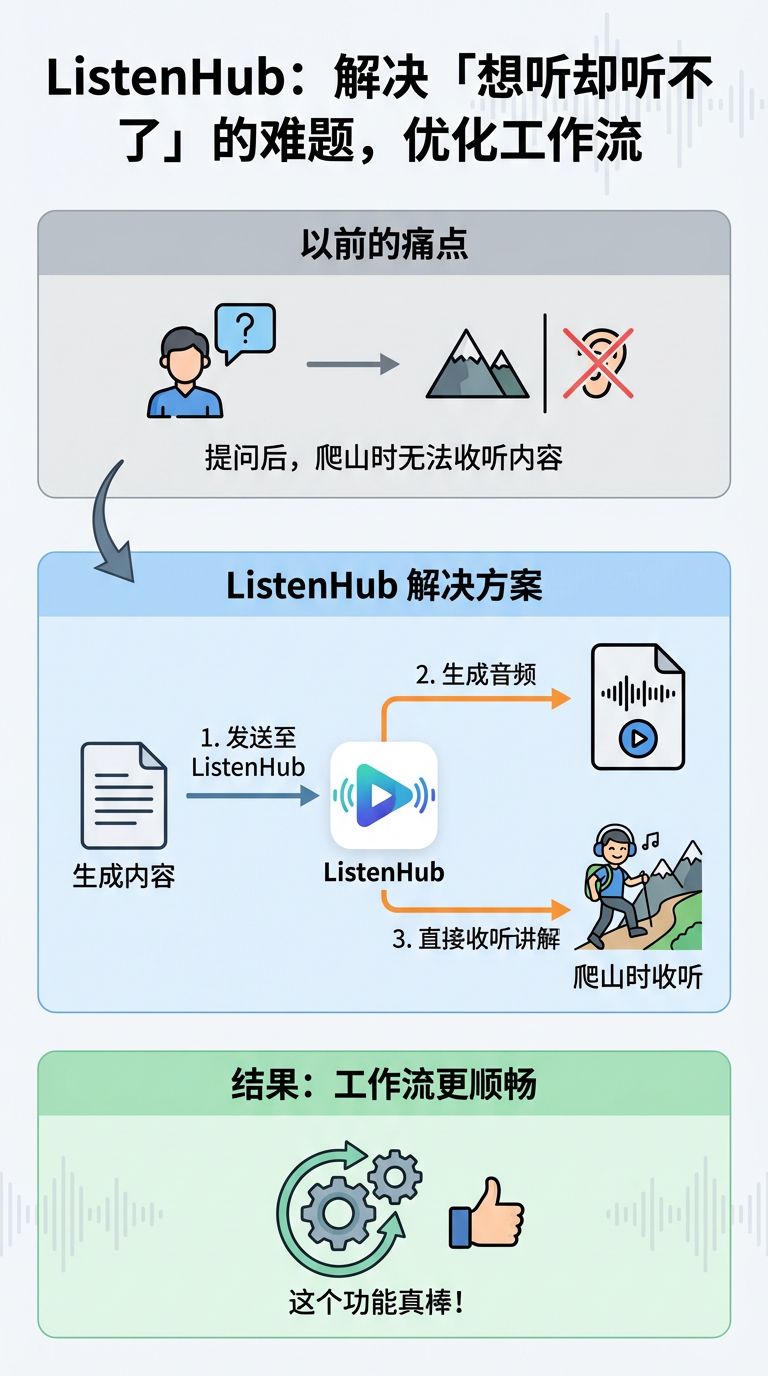 ListenHub 还帮我解决了另一个问题。以前我提问后,在爬山时想听内容却听不了。现在我可以把生成的内容发到 ListenHub,让它生成音频。生成后,我就能直接听它讲,这样我的工作流就顺畅多了。这个功能挺好的。