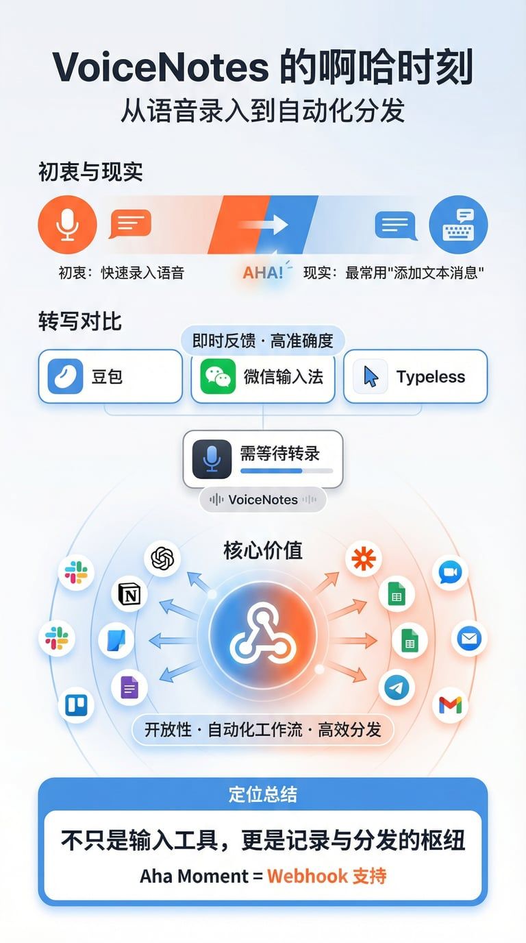 在我看来,VoiceNotes 的定位更偏向于一个记录工具。但它的核心价值,或者说让我感到“啊哈时刻(Aha Moment)”的地方,在于它对 Webhook 的支持。通过这一特性,我能够构建各种自动化工作流,将记录的内容高效分发到其他平台进行后续处理。