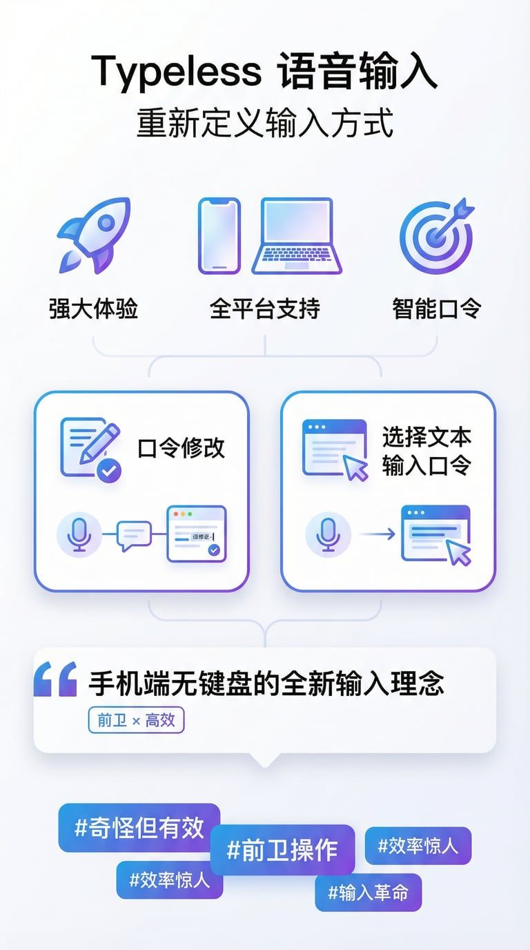 正在尝试使用 Typeless 进行语音输入,体验真的太强大了!🚀不仅同时支持手机端和电脑端,最硬核的是它支持“口令修改”和“选择文本输入口令”。手机端就没有键盘,这是一种非常强大的、或者说全新的一种输入理念。这种操作逻辑虽然有点“奇怪”和前卫,但效率确实惊人。