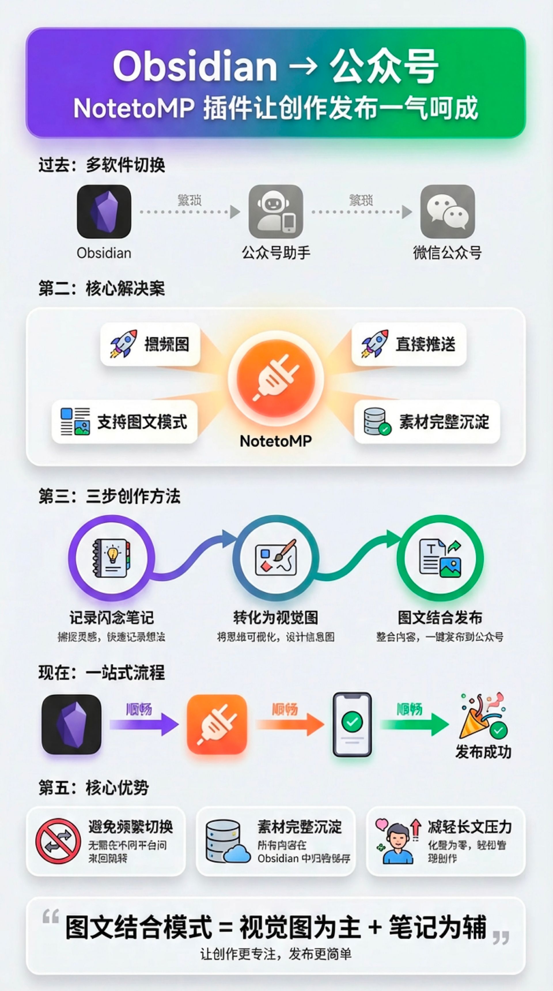 正好有一款插件叫 NotetoMP,它支持将当前文章直接推送到微信公众号助手,并支持图文模式。我的创作习惯是先记录闪念笔记,再将其转化为视觉图,最后以视觉图为主、笔记为辅进行发布。这种“图文结合”的模式大大减轻了写长文的压力。