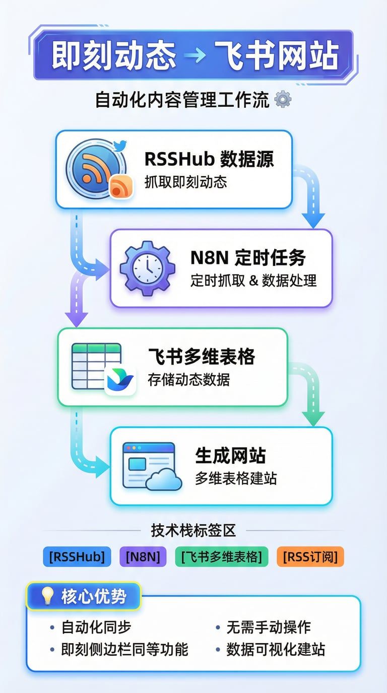 使用即刻的rsshub数据源,可以通过N8N定时抓取RSS的动态,然后将发布在即刻的动态保存到飞书多维表格中,再通过飞书多维表格做网站。其实这个能力和即刻侧边栏是一样的功能,没想到居然可以用N8N来实现。