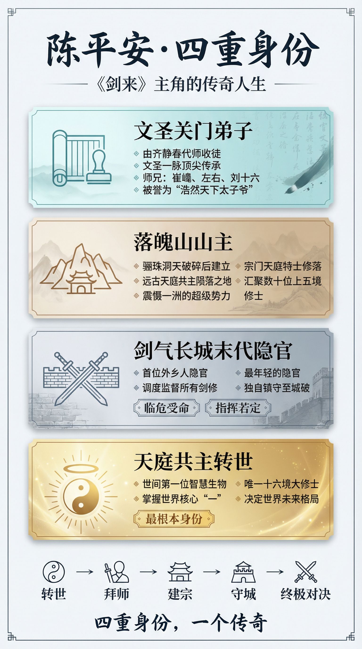 陈平安是小说《剑来》的主角,其核心身份可总结为以下四点,每一个都背景深厚、影响深远: