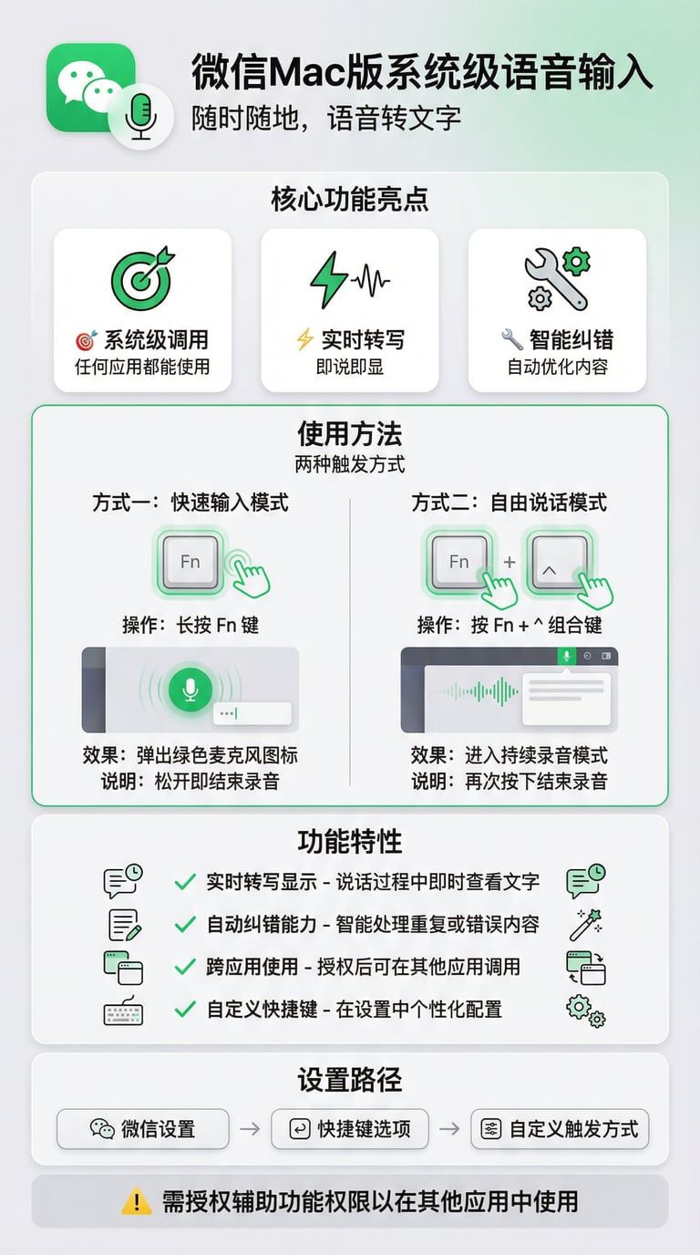 微信在Mac版本中加入系统级语音输入功能,用户可通过快捷键在任何应用场景下进行语音转文字输入。