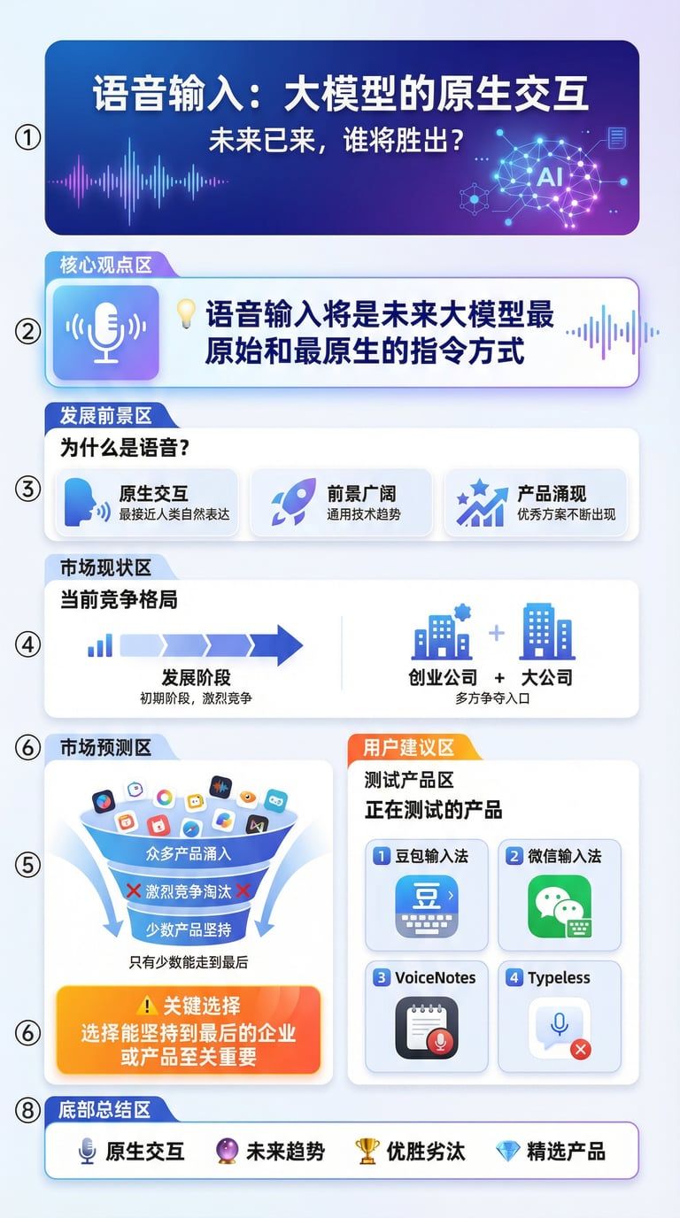 语音输入将是未来大模型最原始和最原生的指令方式。这个场景前景广阔,已经涌现出几个优秀的产品。可以预见,这种能力将逐渐成为一种非常通用的技术,与人类自然语言的表达高度贴近。目前,尽管仍处于初期阶段,但多家创业公司和大公司已经开始争夺这一入口,竞争非常激烈。然而,最终只有少数产品能够坚持下来,用户将从中受益,因此选择一家能坚持到最后的企业或产品至关重要。目前正在测试的软件有:豆包输入法、微信输入法、voicenotes, typeless。
