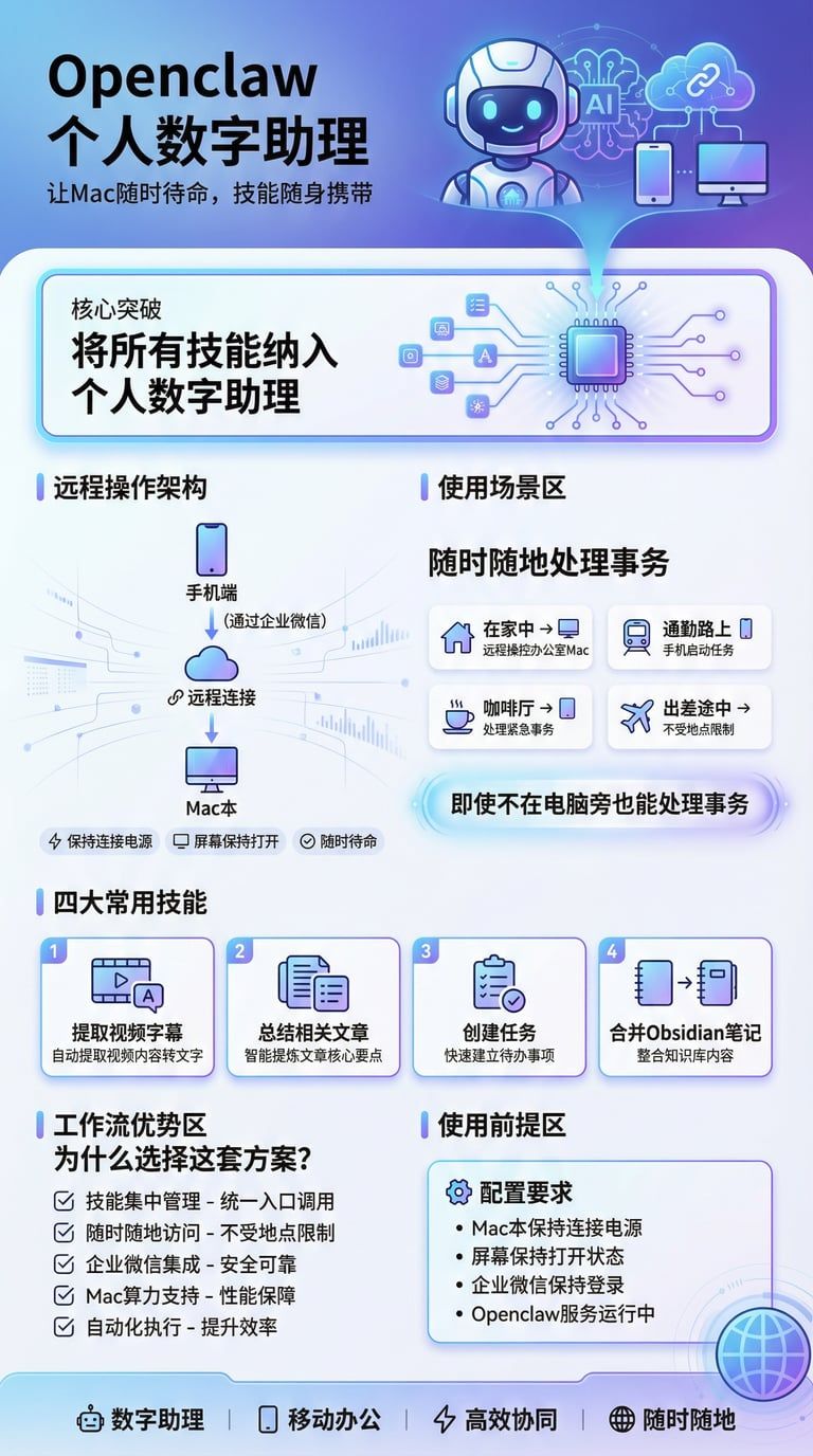 有了[[Openclaw]]后,可以将所有技能纳入个人数字助理中。与此同时,保持Mac本连接电源并打开屏幕,使得在任意地方都能通过手机的企业微信操作Mac本。这样,即使不在电脑旁也能处理事务。目前,常用的几个技能包括:提取视频字幕、总结文章、创建任务以及合并obsidian中的笔记。