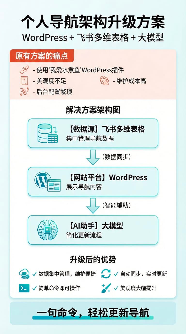 尝试改进网站导航,将原来使用的“我爱水煮鱼”的WordPress插件替换为飞书多维表格做为数据源,解决美观和后台配置问题。成功将飞书多维表格的数据同步到 WordPress,并在大模型的支持下完成改造。现在,只需简单命令即可更新导航。个人导航架构:wordpress+飞书多维表格+大模型